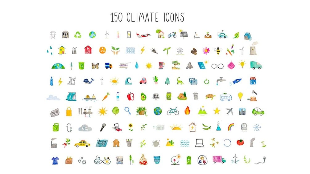 150 small climate icons that are great for pitch decks, website design, presentations, and social media.